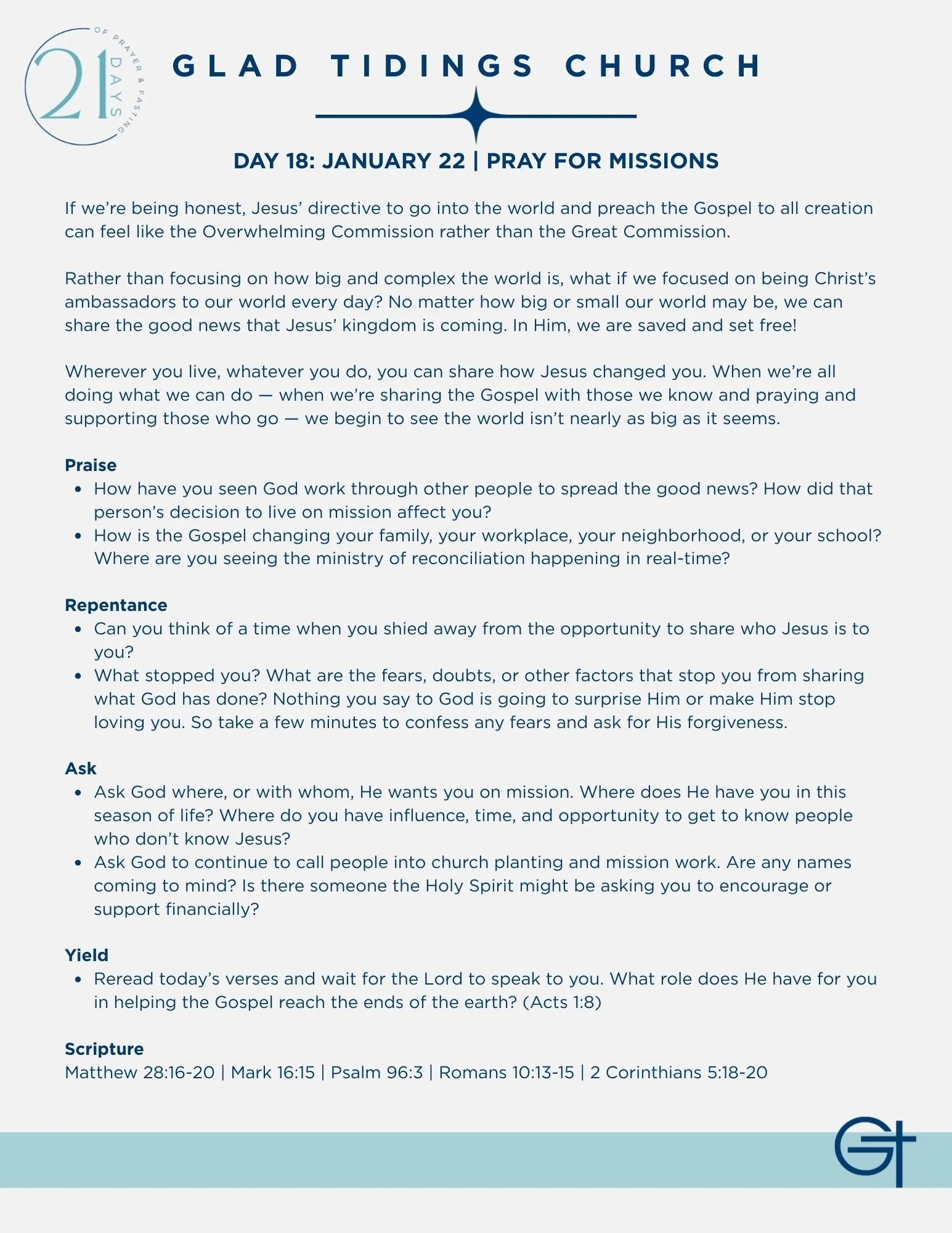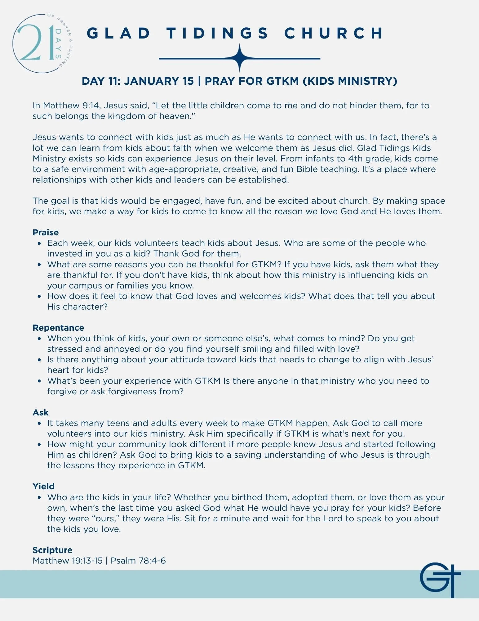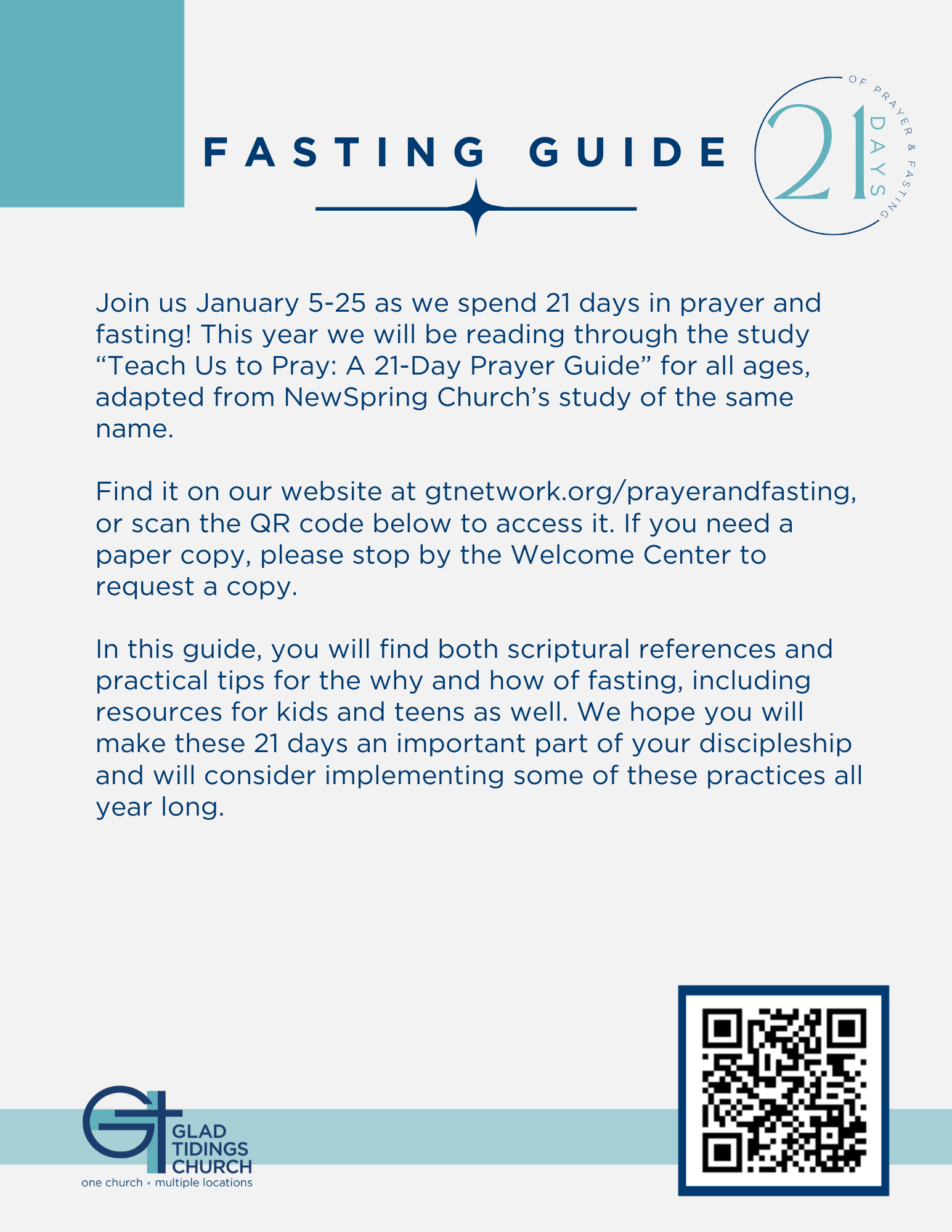 Join us January 5-25 as we spend 21 days in prayer and fasting! This year we will be reading through the study “Teach Us to Pray: A 21-Day Prayer Guide” for all ages, used with permission and adapted from NewSpring Church’s study of the same name.