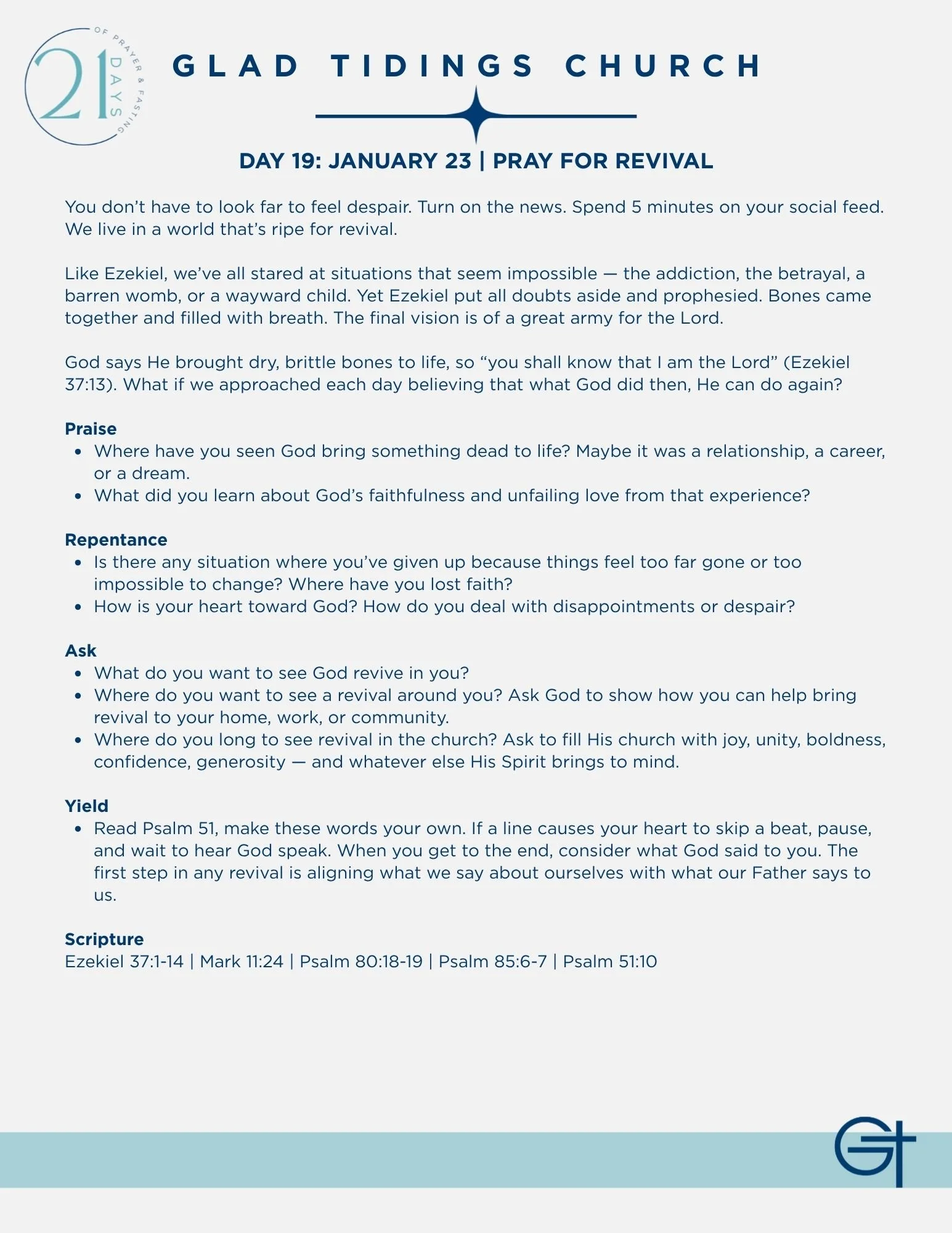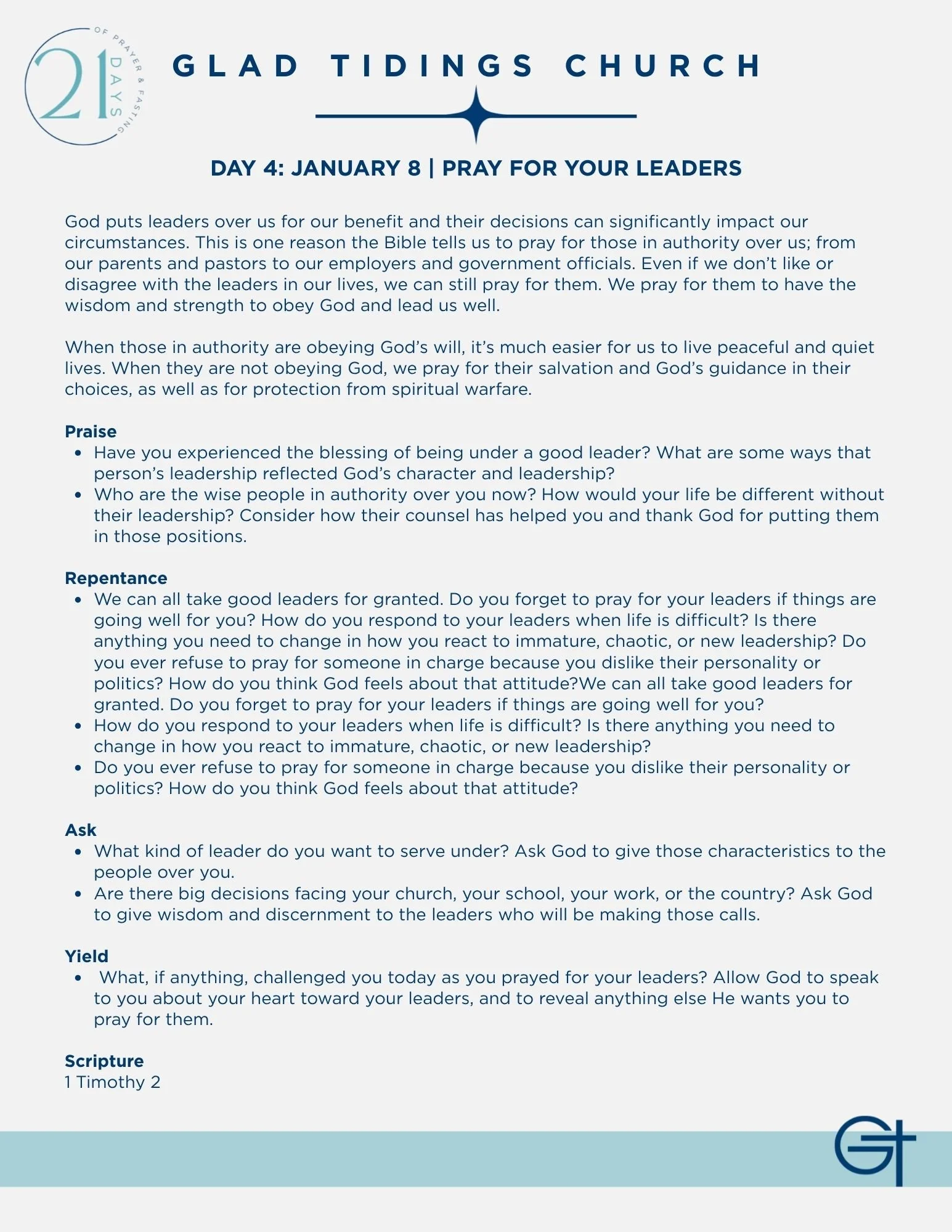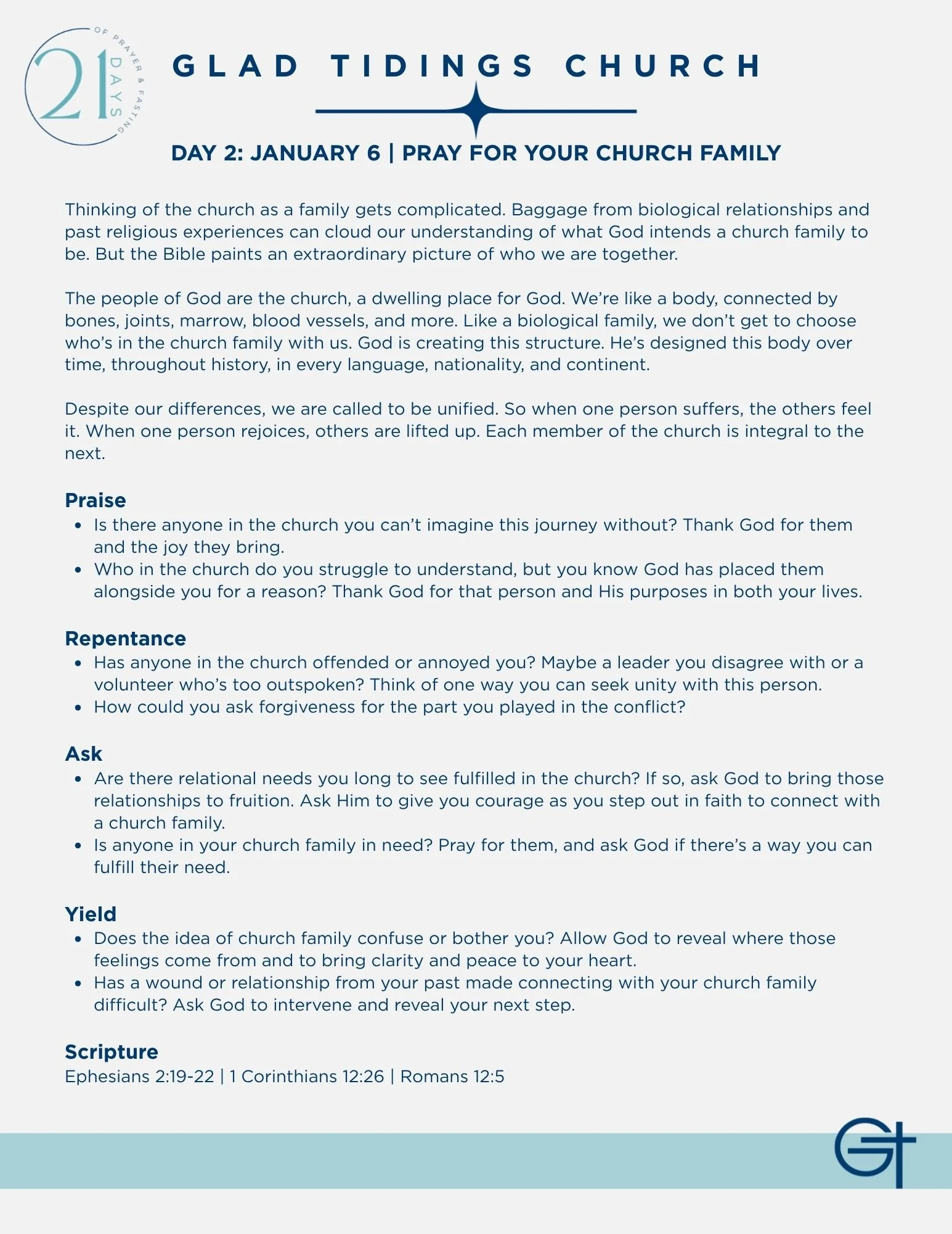 Join us January 5-25 as we spend 21 days in prayer and fasting! This year we will be reading through the study “Teach Us to Pray: A 21-Day Prayer Guide” for all ages, used with permission and adapted from NewSpring Church’s study of the same name.